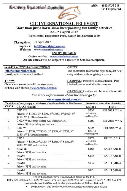 Add to your Calendar22-04-2017 00:00:0024-04-2017 00:00:00Australia/SydneyEventing Equestriad International One Day EventEventing Equestriad International One Day Event Location Bi-Centennial Park, Camden NSW